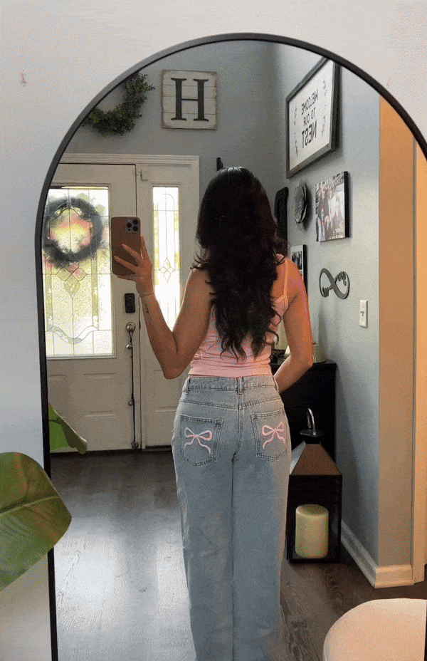 A playful twist on your favorite basic. The delicate bows embroidered onto the back pockets give the relaxed jeans the perfect trendy and casual chic look.